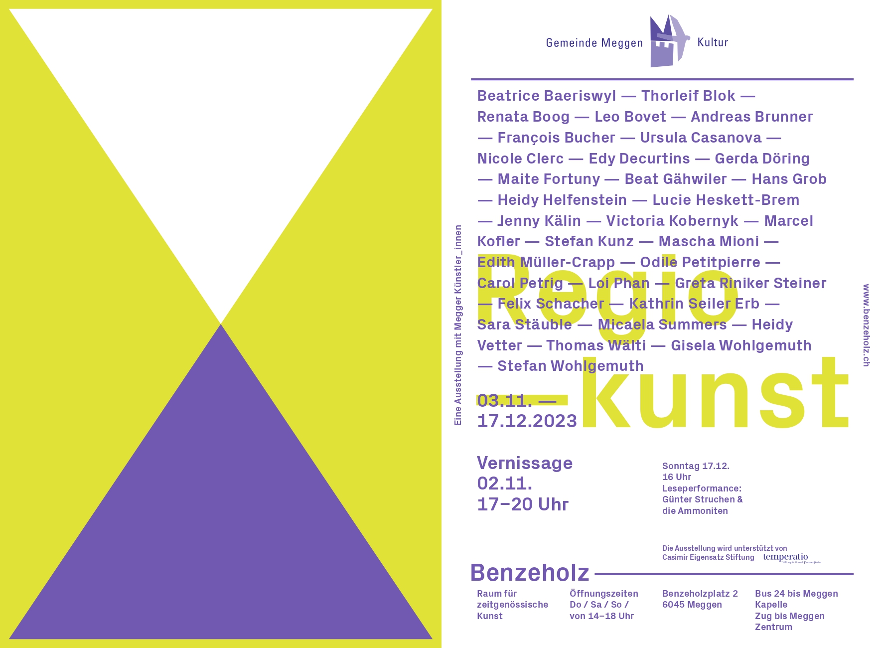 Mit Werken von: Beatrice Baeriswyl, Thorleif Blok, Renata Boog, Leo Bovet, Andreas Brunner, François Bucher, Ursula Casanova, Nicole Clerc, Edy Decurtins, Gerda Döring, Maite Fortuny, Beat Gähwiler, Hans Grob, Heidy Helfenstein, Lucie Heskett-Brem, Jenny Kälin, Victoria Kobernyk, Marcel Kofler, Stefan Kunz, Mascha Mioni, Edith Müller-Crapp, Odile Petitpierre, Carol Petrig, Loi Phan, Greta Riniker Steiner, Felix Schacher, Kathrin Seiler Erb, Sara Stäuble, Micaela Summers, Heidy Vetter, Thomas Wälti, Gisela Wohlgemuth, Stefan Wohlgemuth