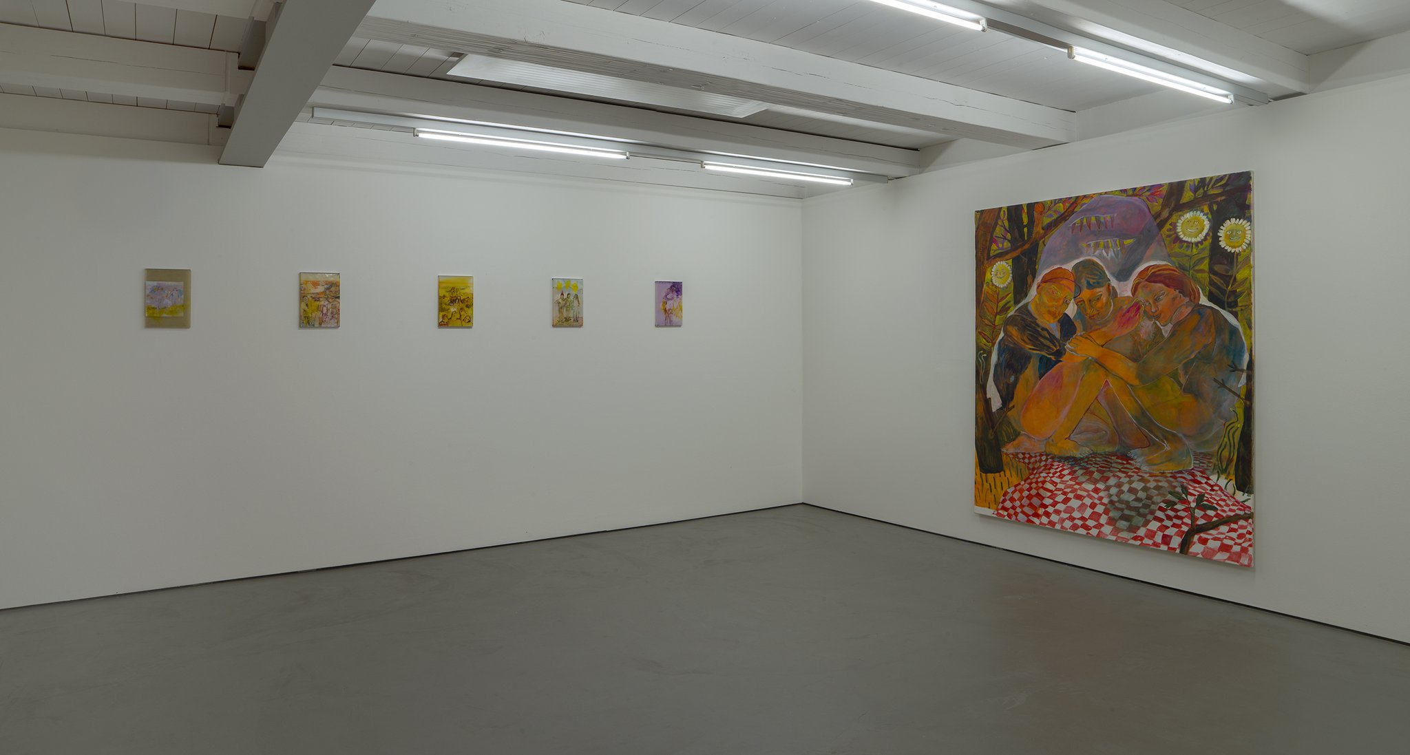 Gleich zu Beginn der Ausstellung treten die Werke von Jeanne Jacob und Dimitris Tampakis in einen Dialog. In der kleinformatigen Serie «All or nothing at all» (2025), die während Jacobs Arbeitsaufenthalt in Athen entstand, erforscht die Künstlerin die Natur menschlicher Verbindungen. Indem sie die Komplexität von Emotionen untersucht, schafft sie einen Raum, in dem Mehrdeutigkeit zum Mittel der Selbstreflexion wird. Zugleich verweist das Werk darauf, dass Vorstellungen von Nähe und Intimität immer auch von normativen Erwartungen geprägt sind. Selbst im Moment des Ausbruchs aus den Normen bleibt man von den Massstäben des eigenen Kontextes beeinflusst. Dabei sind diese Ordnungen wandelbar, auch wenn sie sich stabil und unverrückbar geben. Auf Fotopapier gemalt und in Epoxid gegossen, entwickeln die Zeichnungen eine fragile, vielschichtige Bildoberfläche. Das Epoxid entzieht sich der vollständigen Kontrolle, lässt Unvorhergesehenes zu und erzeugt Momente des Zufalls. So entstehen Werke, die wie Collagen wirken: ein wenig entrückt und träumerisch. Die Erzählungen sind nicht linear und nicht und die Narrative, die die Figuren verbinden, speisen sich aus dem, was der Künstlerin beim Entstehen begegnet und was sie miteinander verwob: Motive, Stimmungen, Eindrücke.