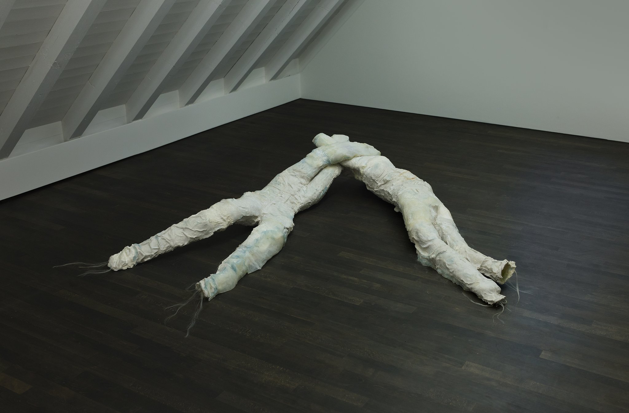 Im Dachgeschoss begegnen wir der Skulptur «Here is a chorus floating in my body» (2025). Skurril, science-fictionhaft scheinen die verschlungenen, in Silikon gehüllten Körper wie eingefroren und im Schmelzen begriffen zugleich. Hosenbeine, Gesichter und Haare sind erkennbar, doch als Ganzes entzieht sich die Installation: eine Komposition aus Fragmenten, in der Verbindungen entstehen und sich lösen, Elemente hervortreten, anderes verschleiert bleibt. Das Silikon wirkt trotz seiner Transparenz fleischlich, es schützt und enthüllt gleichermassen. Die Skulptur lockt mit ihrer Groteskheit und ihrer Materialität. Sie zieht uns in einen seltsamen, traumartigen Bann und verführt uns beinahe zur Berührung.