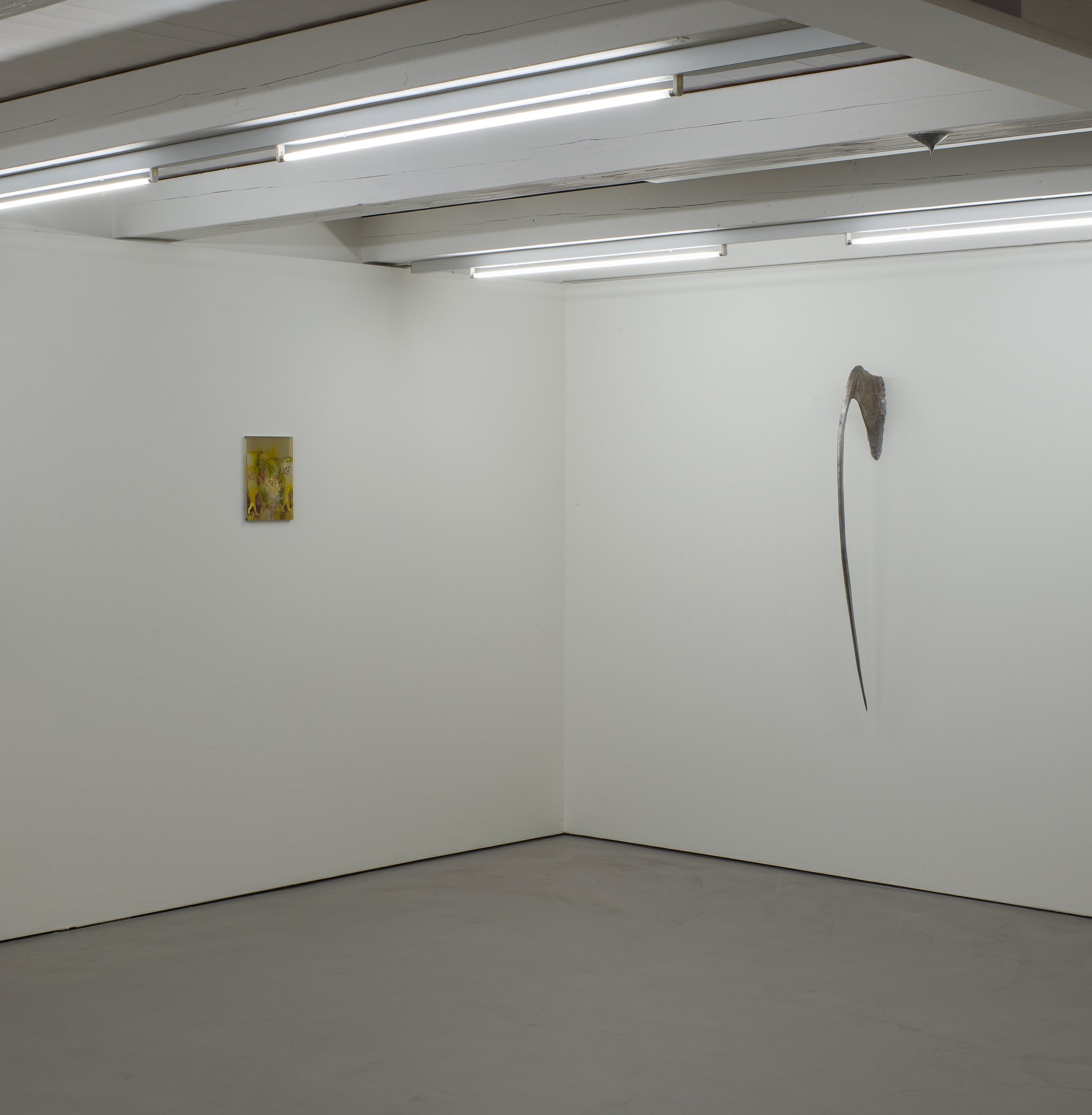 Von der Wand aus beobachten die Figuren in Jeanne Jacobs Diptychon «Whispering Sequences» (2025) die im Raum befindliche Skulptur und referenzieren sie in ihrer eigenen Bizarrheit. So scheinen die auf «Here is a chorus floating in my body» befindlichen Haarbüschel ihren Weg in die Malerei gefunden zu haben. Das Diptychon zeigt zwei aufeinanderfolgende Szenen, wobei jedes Bild am Anfang oder am Ende der Erzählung stehen kann und sich somit in einem metaphorischen kontinuierlichen Fluss durch den ganzen Raum befinden.
